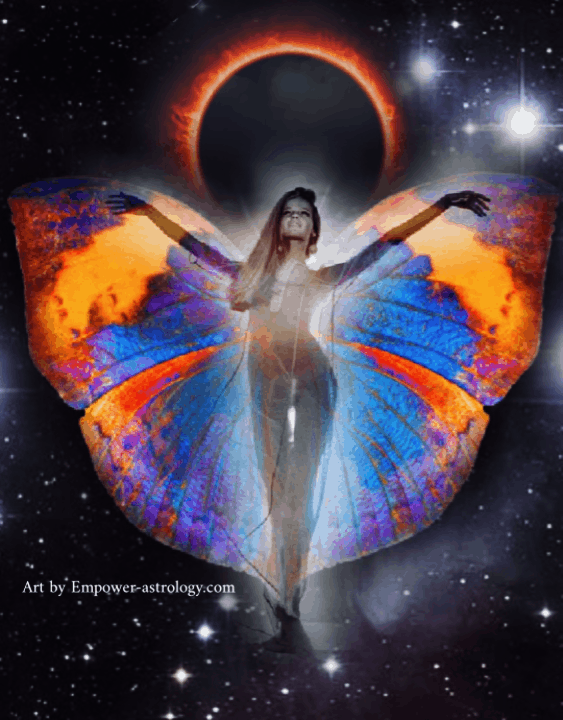An important message carried by the Solar Eclipse is about the ability to go through important changes with grace and lightness. The Butterflies unwavering acceptance of her metamorphosis is also symbolic of faith. Here the butterfly beckons us to keep our faith as we undergo transitions in our lives and emphasizes the ability to move from one state, perspective, lifestyle to another with adaptability.